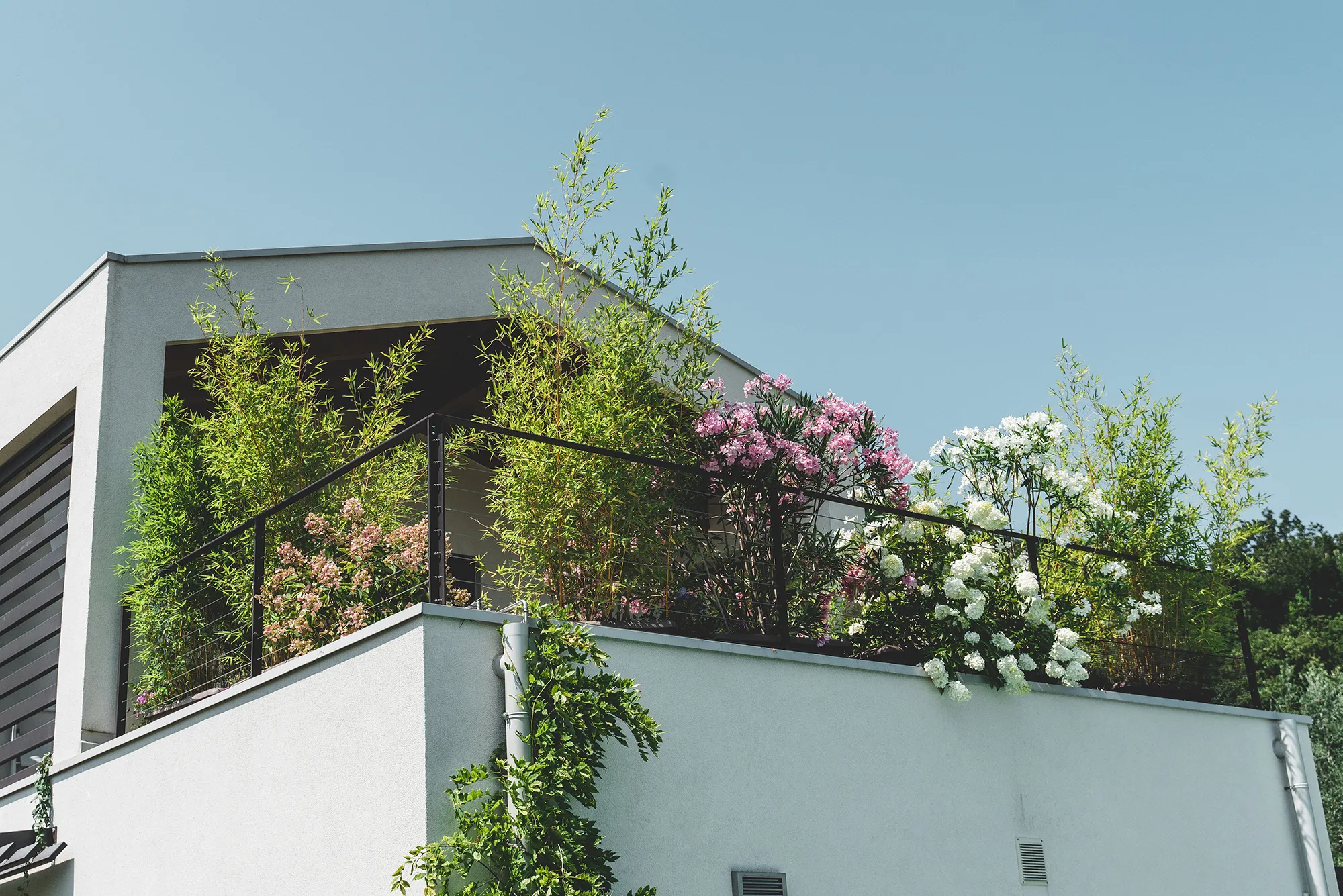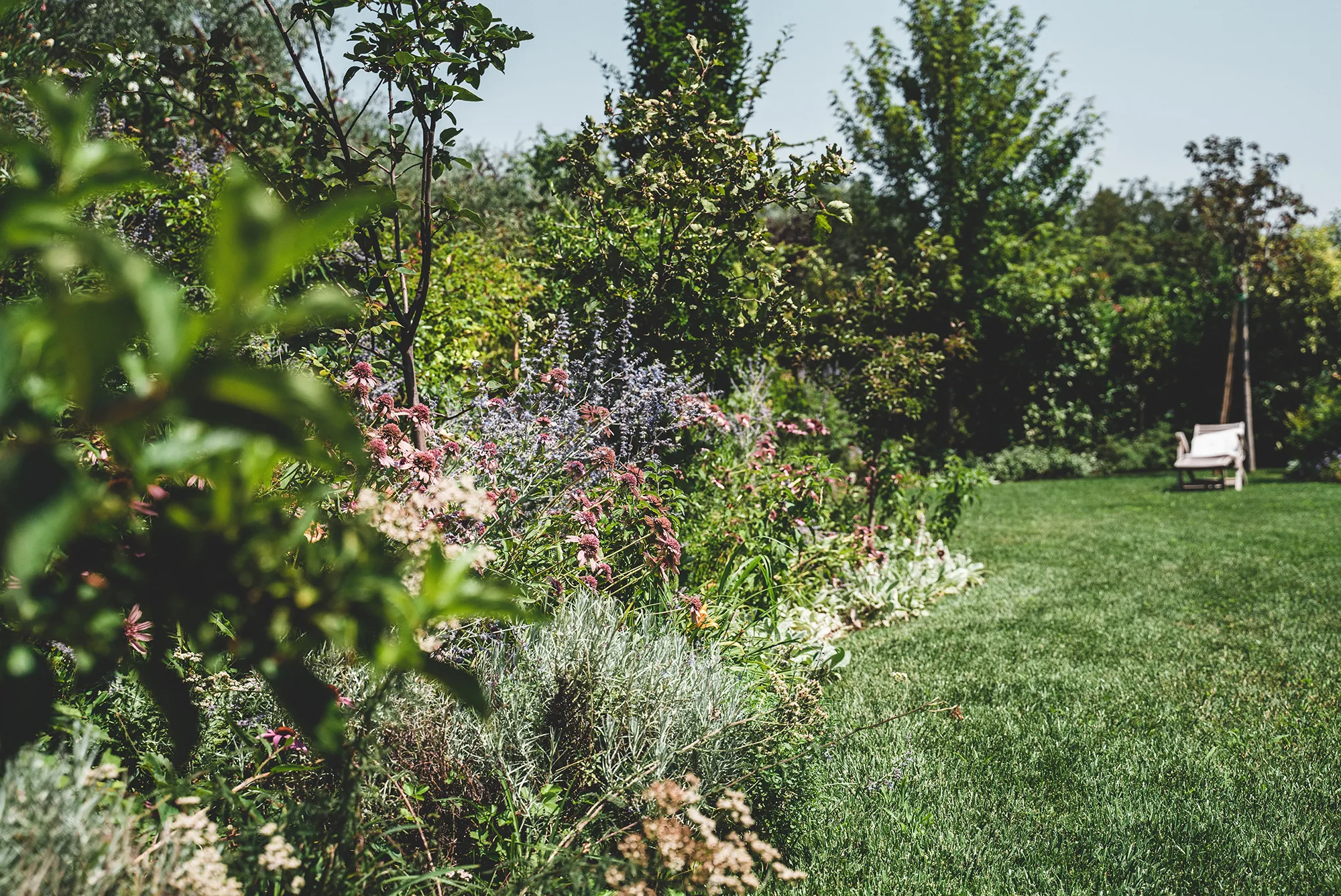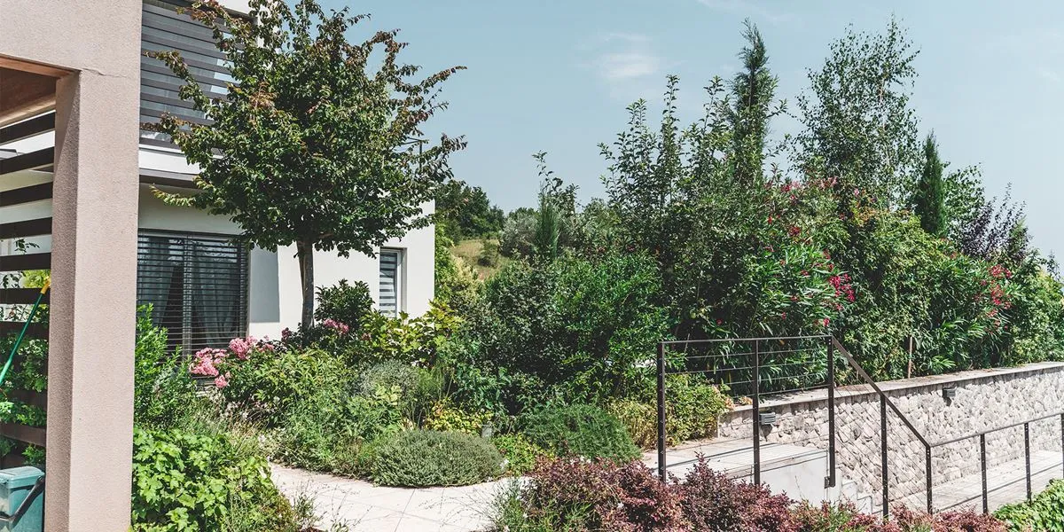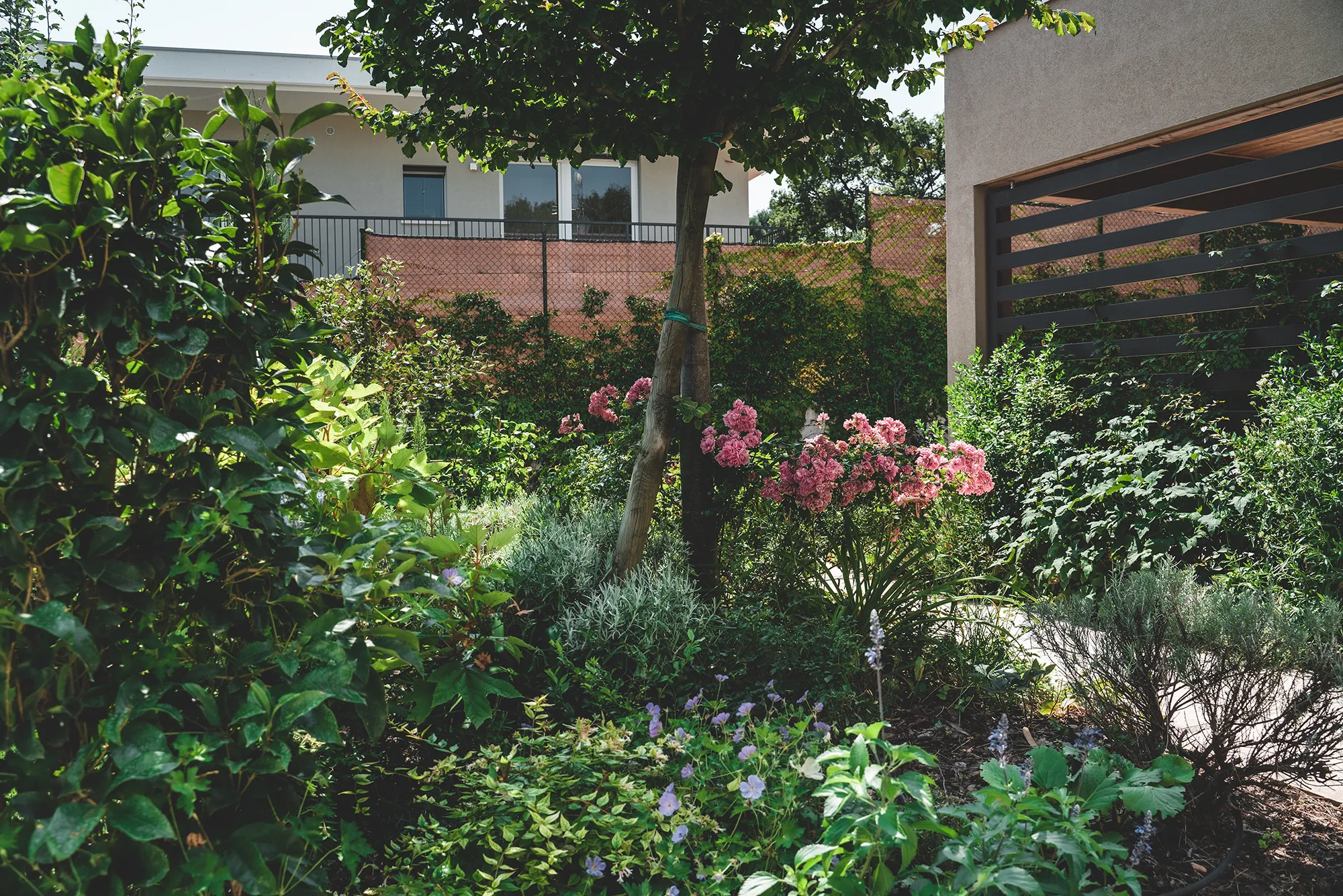 Giardino privato con piscina, ricco di colori e profumi che si inserisce con armonia nel paesaggio naturale di Marciaga, comune di Costermano, a pochi chilometri dal Lago di Garda.