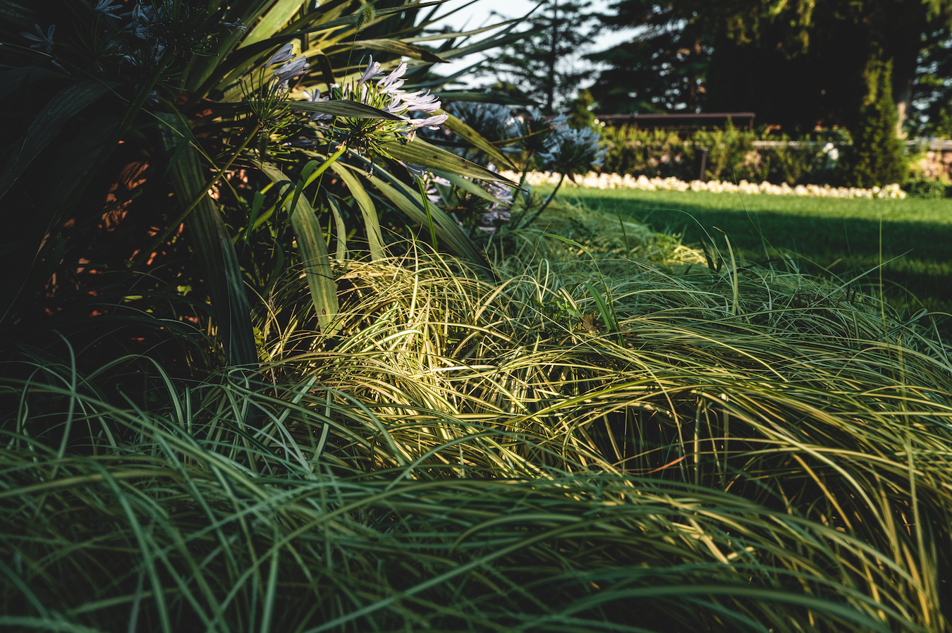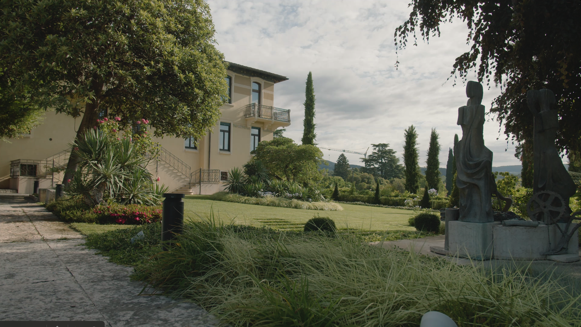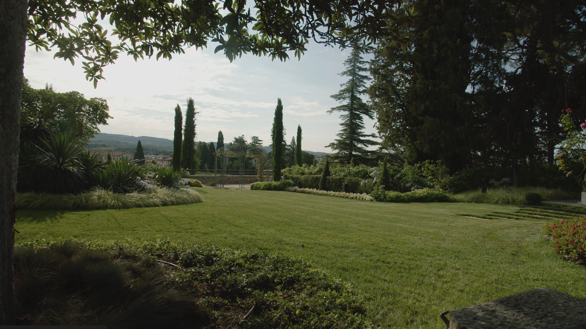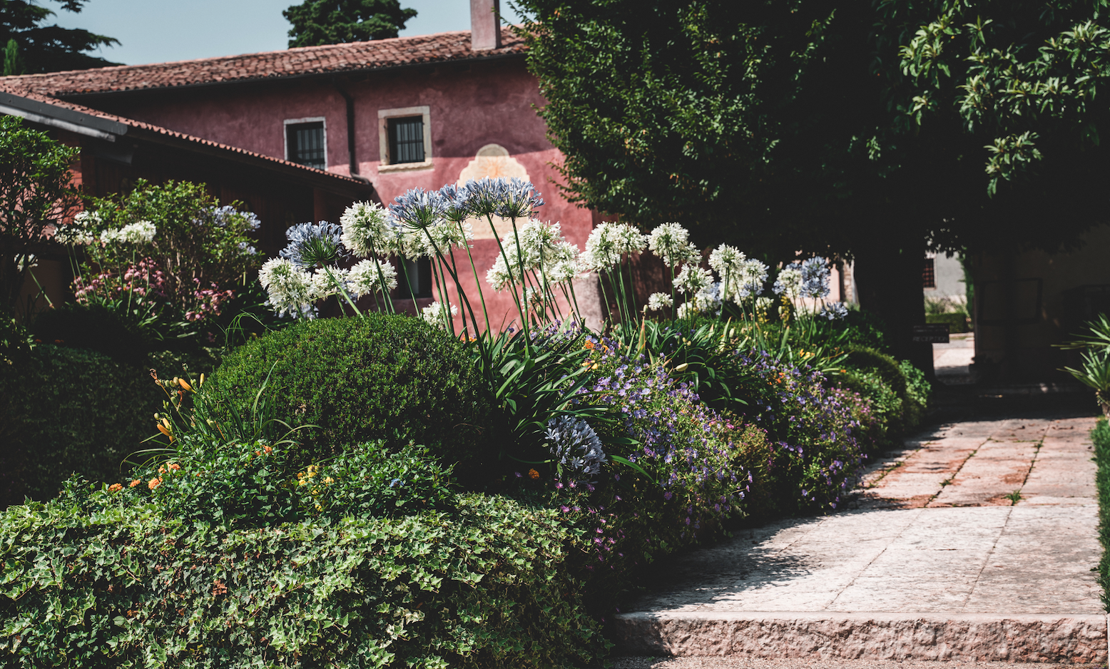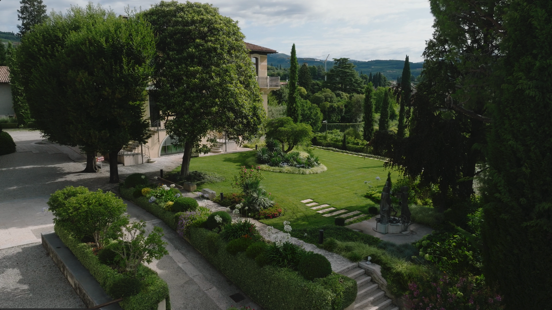 Il primo punto focale del giardino viene rappresentato da una statua in ferro rappresentativa dell’azienda, la quale viene abbracciata su due lati da un letto di tappezzanti (Carex e Vinca) e sul lato frontale alla villa da 5 pietre di dimensioni differenti per dare profondità ed importanza alla vista dalla villa.