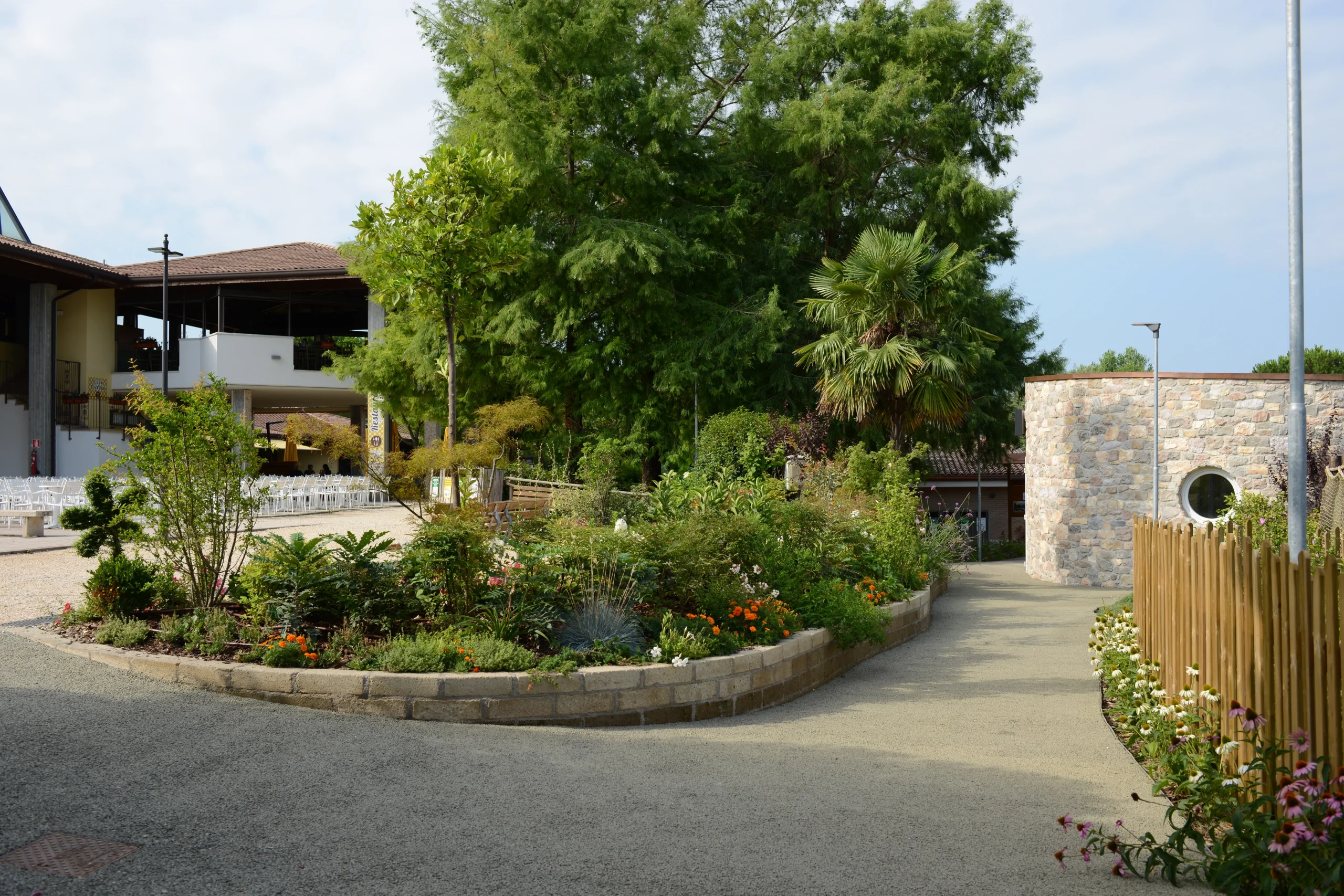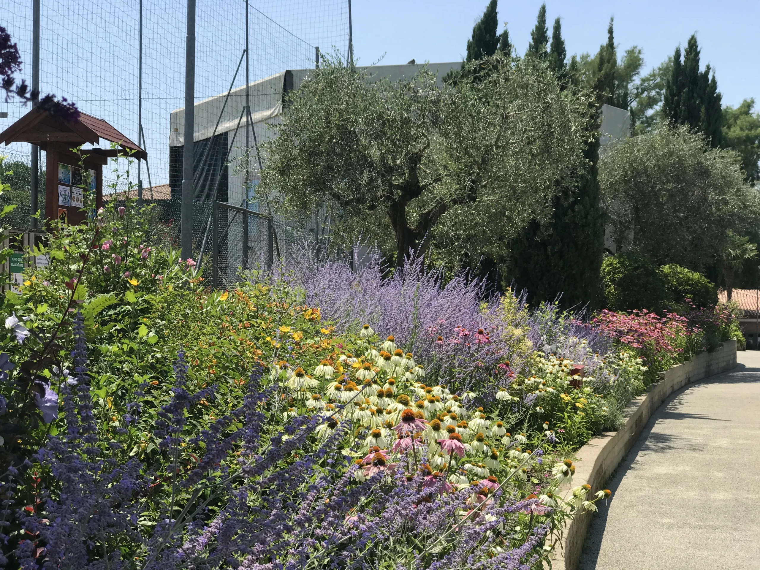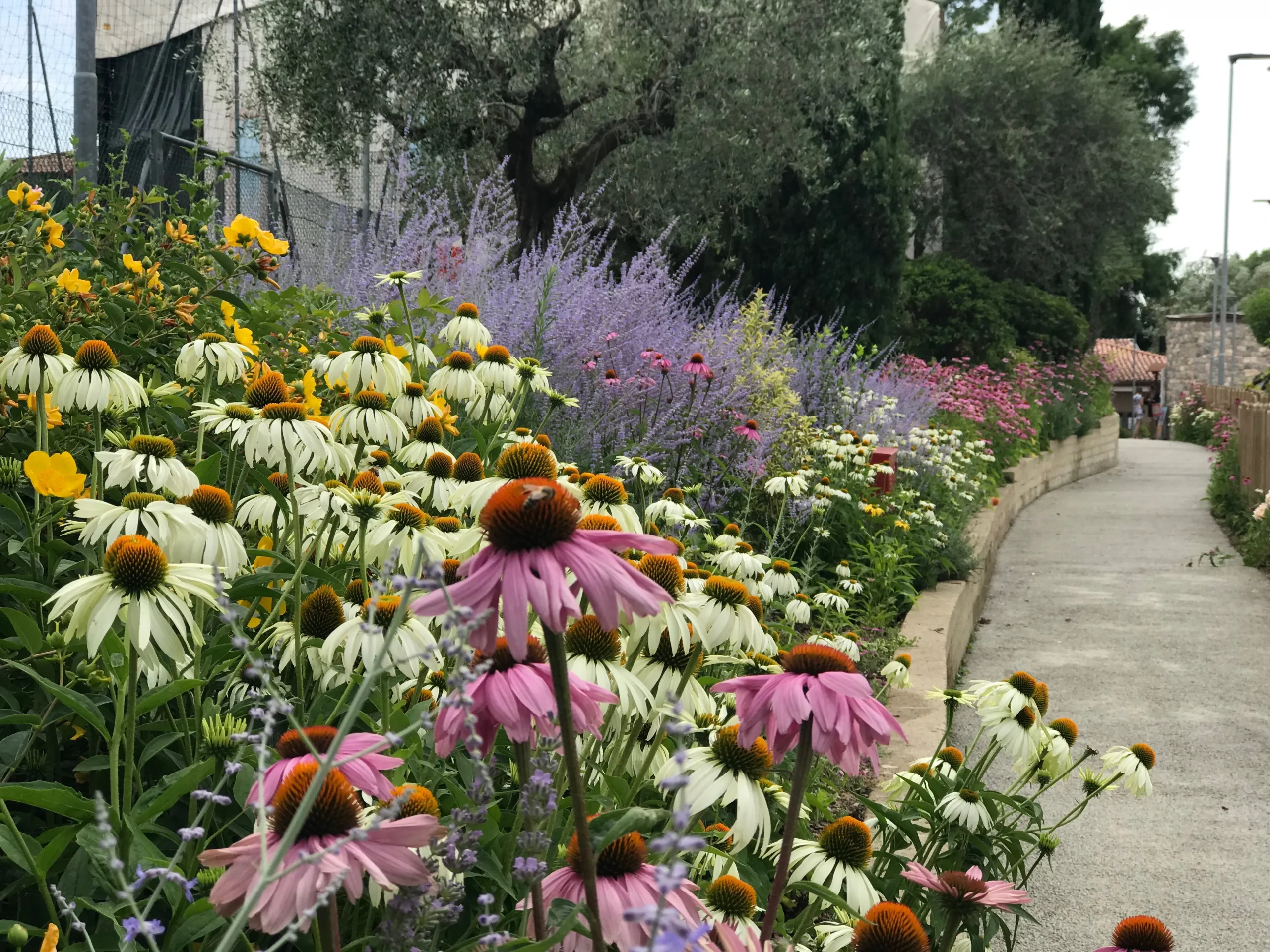 Il biacno e rosso dell’echinacea e degli oleandri con l’azzurro di perovskia e hibiscus vivacizzano la passeggiata.